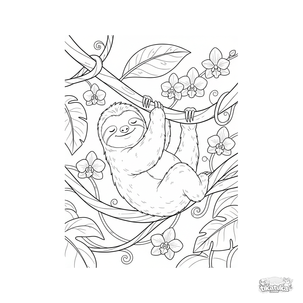 Ausmalbild für Kinder: Ein schläfriges Faultier hängt an einer gewundenen Liane in einem nebligen Regenwald, mit Orchideen. Mittlerer Schwierigkeitsgrad.