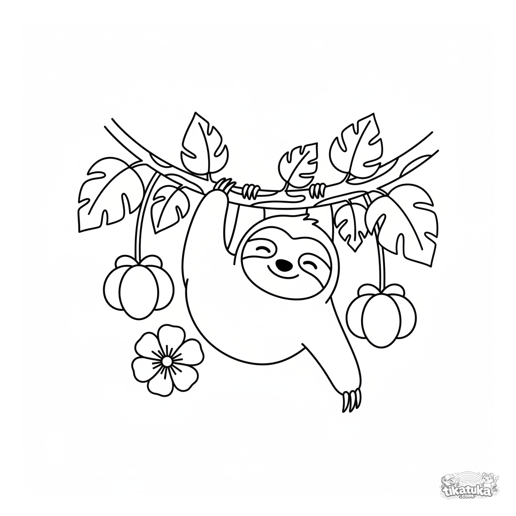 Einfaches Ausmalbild für Kleinkinder 2-3 Jahre mit einem süßen schläfrigen Faultier an einer Lianenbrücke. Große, klare Formen.