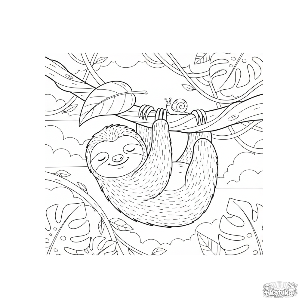 Ausmalbild eines schläfrigen Faultiers für Kinder von 4-6 Jahren. Das Faultier hängt an einer Liane im nebligen Regenwald mit einem Blatthut und einer Schnecke in der Nähe. Mittleres Detaillierungsniveau.