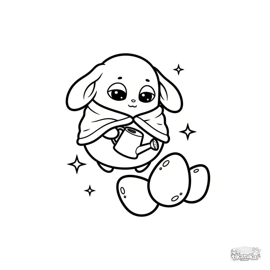 Einfaches Ausmalbild für die Jüngsten: ein schläfriges, flauschiges Alien pflegt Sterneier im Weltraum. Sehr große, geschlossene Formen.