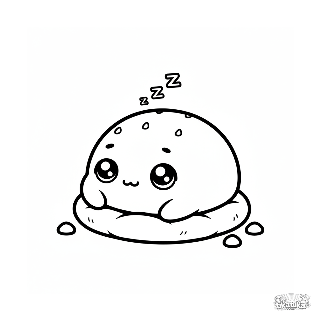 Einfaches Ausmalbild für Kleinkinder 2-3: ein schläfriger Erdbeer-Mochi auf einem Kissen. Große Formen, wenige Details.