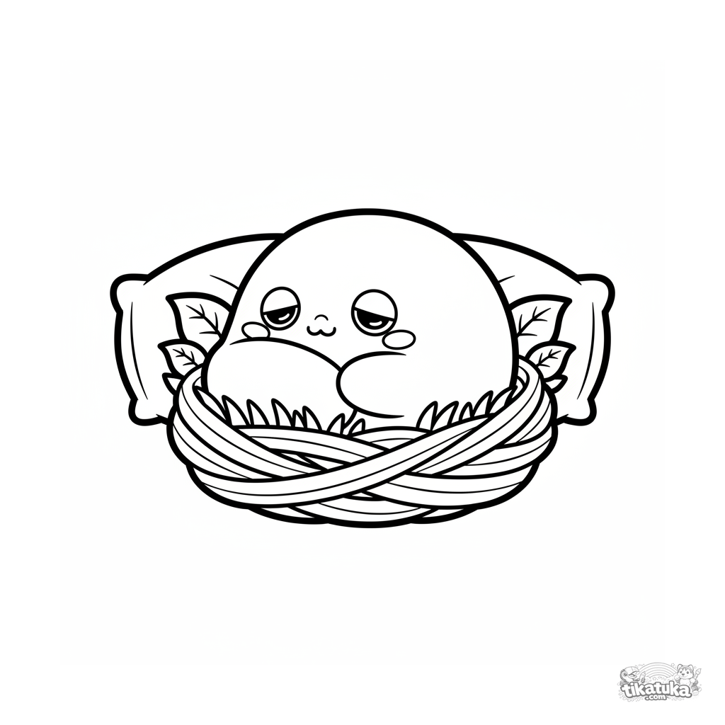 Einfaches Ausmalbild für Kleinkinder: ein schläfriges Erdbeer-Mochi in einem gemütlichen Nest. Große Formen, wenige Details.