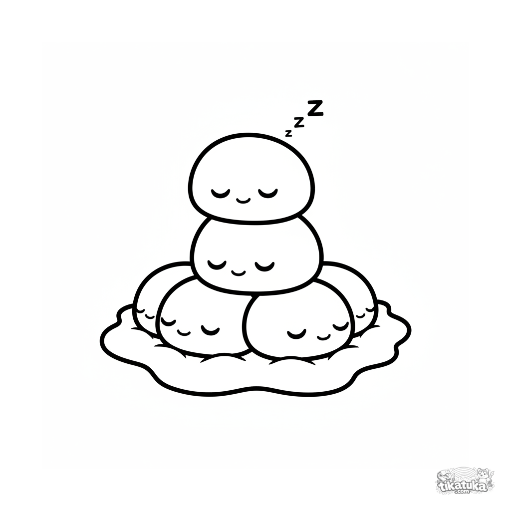Einfaches Ausmalbild für Kleinkinder 2-3 Jahre: ein Stapel schläfriger Erdbeer-Mochi. Große Formen, wenige Details, breite Ränder zum Ausmalen.