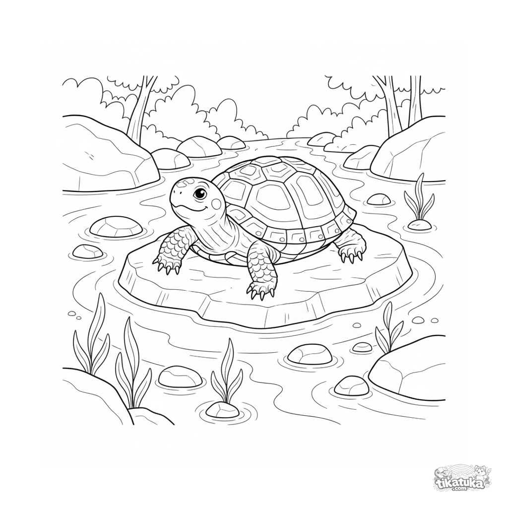 Ausmalbild für 7-9 Jahre: Eine schläfrige Schildkröte sonnt sich auf einem Stein in einem klaren Bach. Detaillierter Panzer und Wasserfluss, realistischer Stil.