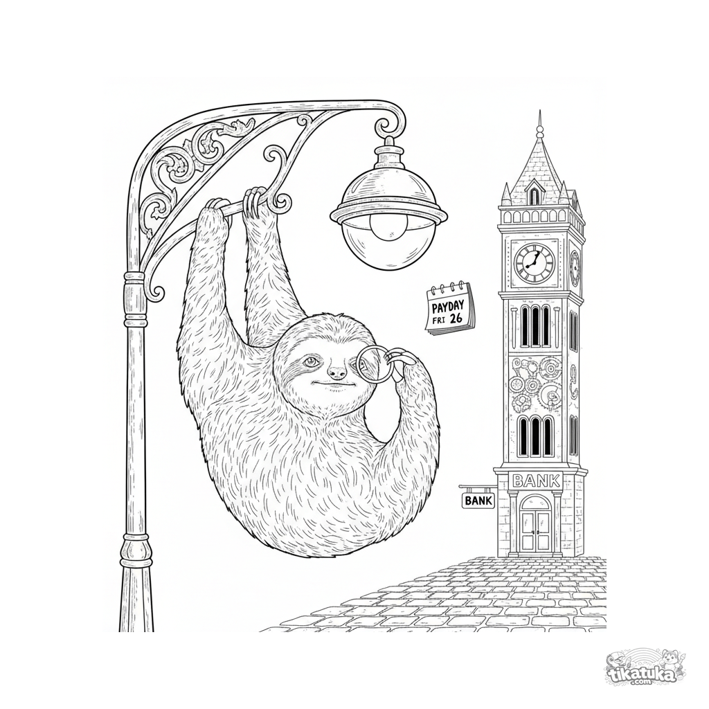 Ausmalbild für Kinder 10-12: Ein Faultier hängt an einer Straßenlaterne und schaut durch ein Monokel zu einem Bankturm, auf der Suche nach dem Zahltag. Detaillierte Szene im Vintage-Stil.