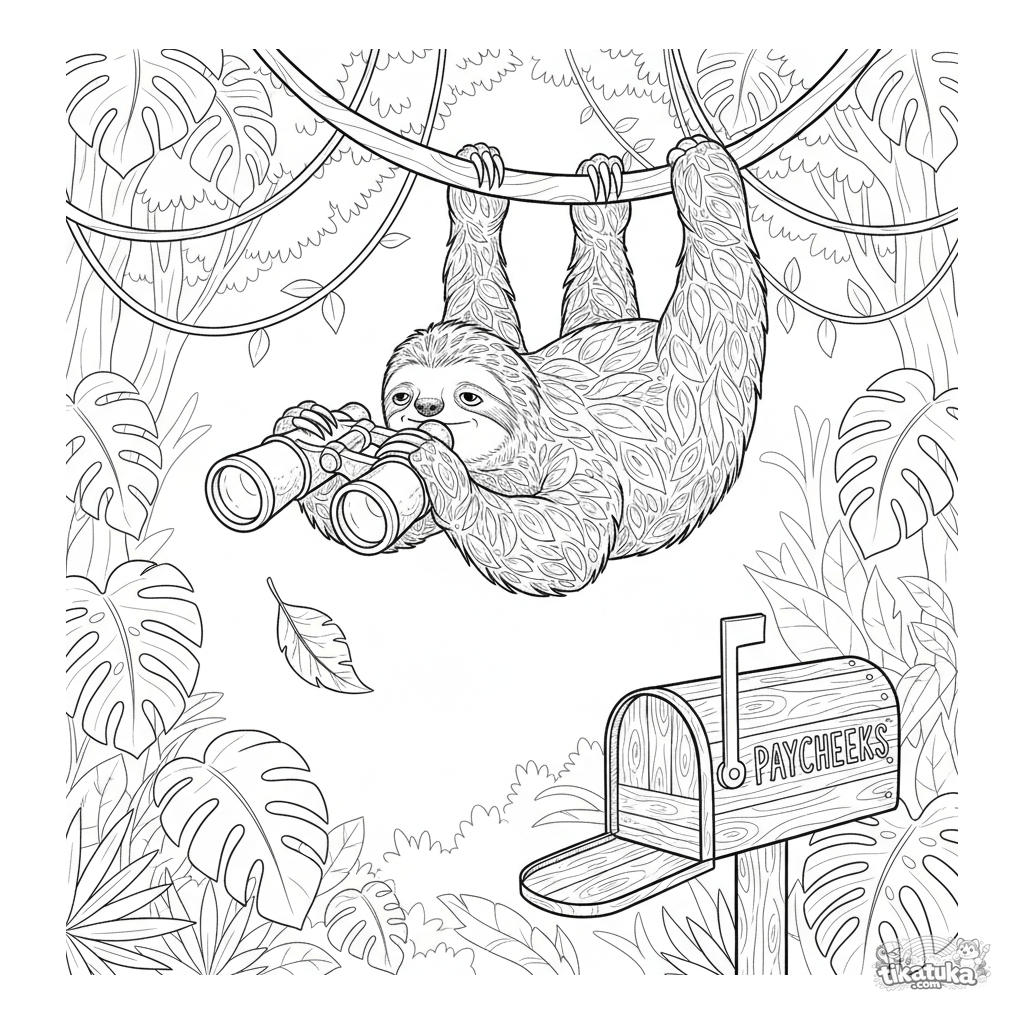 Ausmalbild für Kinder 10-12: Ein Faultier, das an einer Liane hängt, beobachtet mit einem Fernglas einen Gehaltstag-Briefkasten. Lustige, detaillierte Szene im Aquarell-Skizzen-Stil.