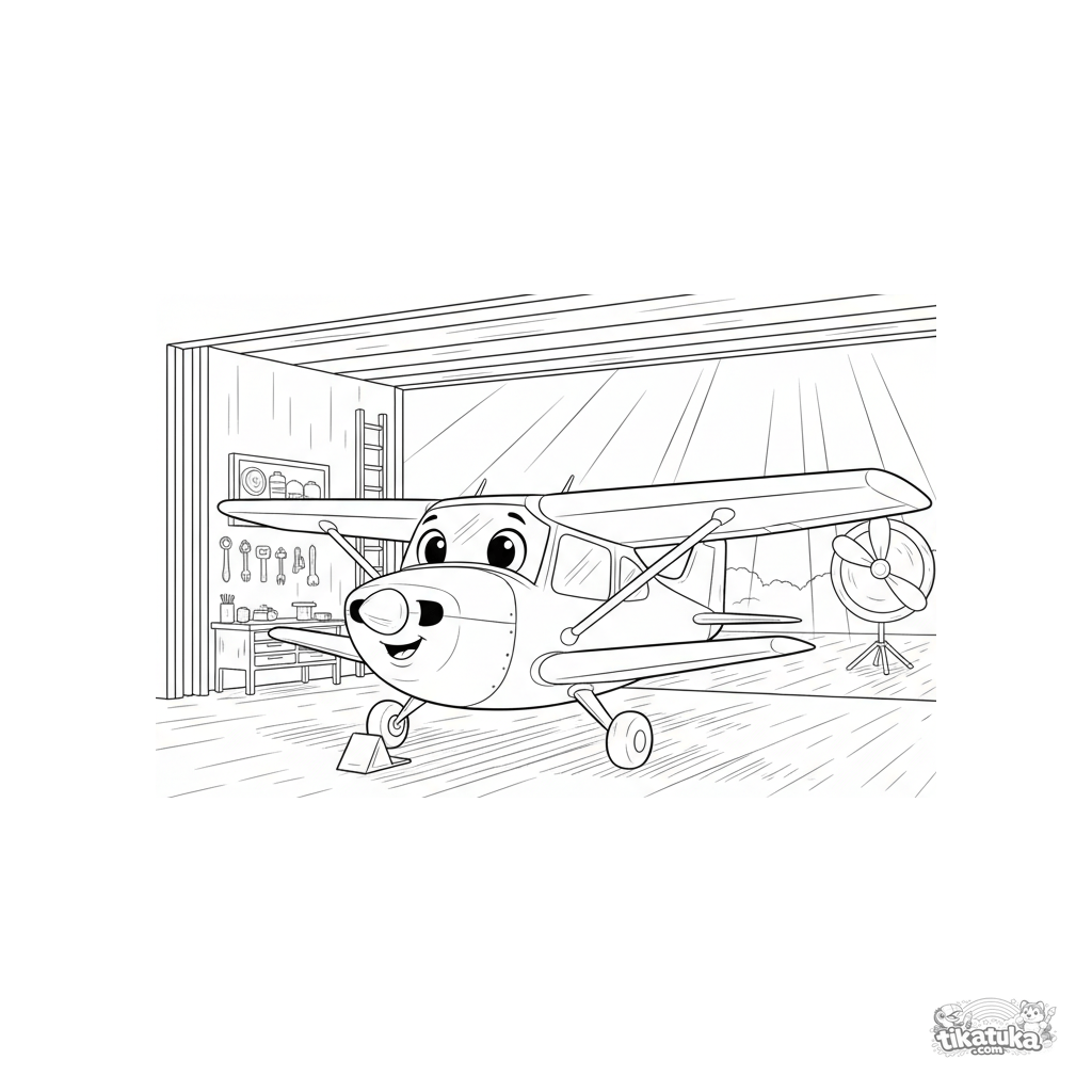 Ausmalbild für Kinder 4-6: Ein kleines Flugzeug, geparkt in einer offenen Halle, im Sonnenlicht. Gemütliche, friedliche Szene.