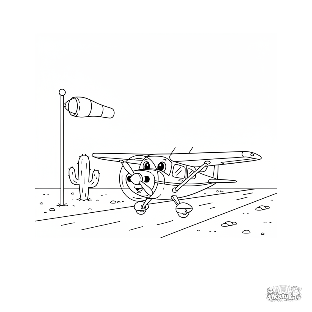 Ausmalbild eines Kleinflugzeugs auf einer Wüstenlandebahn. Für 4-6 Jahre. Einfache Formen, ein Kaktus und ein Windsack unter weitem Himmel.