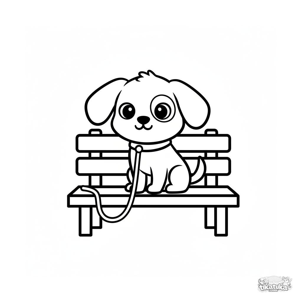 Einfaches Ausmalbild für Kleinkinder 2-3: Ein kleiner Hund an der Leine wartet auf seinem Besitzer auf einer Parkbank. Minimalistisches Design, große klare Formen.