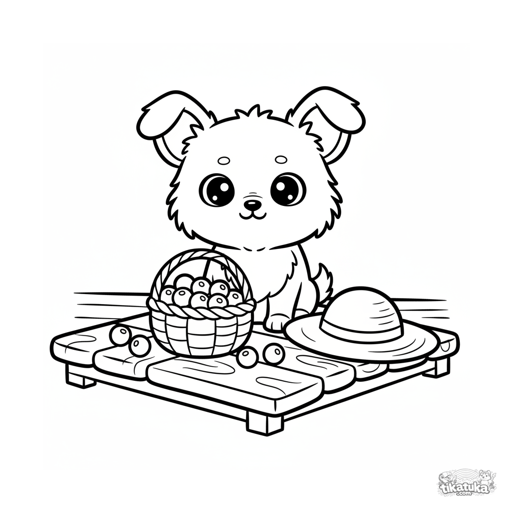 Sehr einfaches Ausmalbild für Kleinkinder 2-3: Ein kleiner Hund sitzt neben einem Korb voller Beeren auf einer Veranda. Große, klare Umrisse.