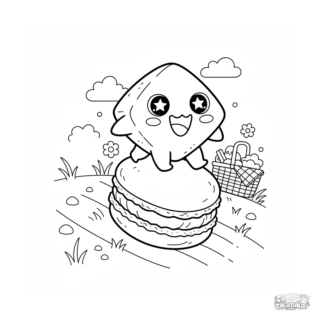 Ausmalbild für Kinder von 7-9 Jahren: ein kleines diamantförmiges Monster reitet auf einem Riesen-Macaron einen Hang hinunter in der Nähe eines Picknickkorbs. Niedlicher Kawaii-Stil, fröhlicher Ausdruck.