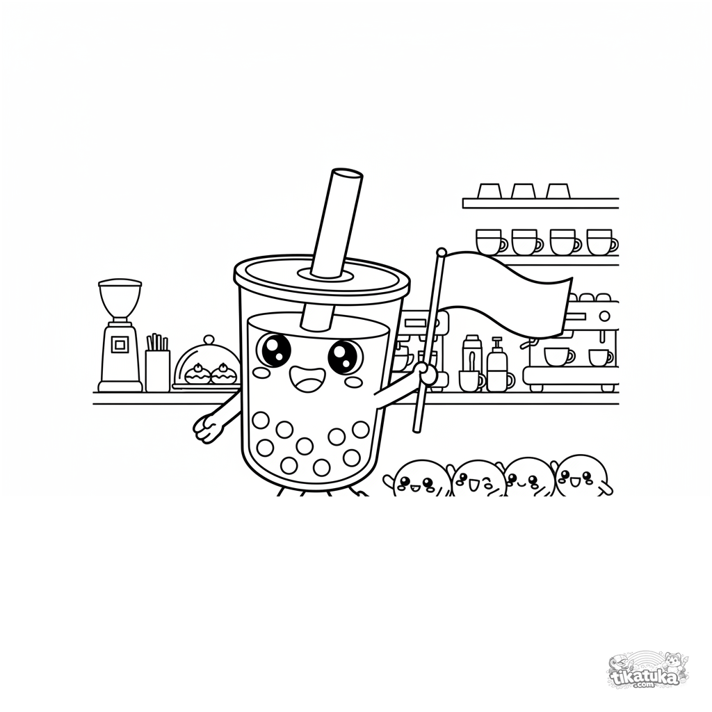 Ausmalbild für Kinder: Ein lächelnder Boba-Becher marschiert über einen Café-Tresen mit Mochi-Freunden. Lustige Szene für kreative Kinder im Alter von 4-6 Jahren.