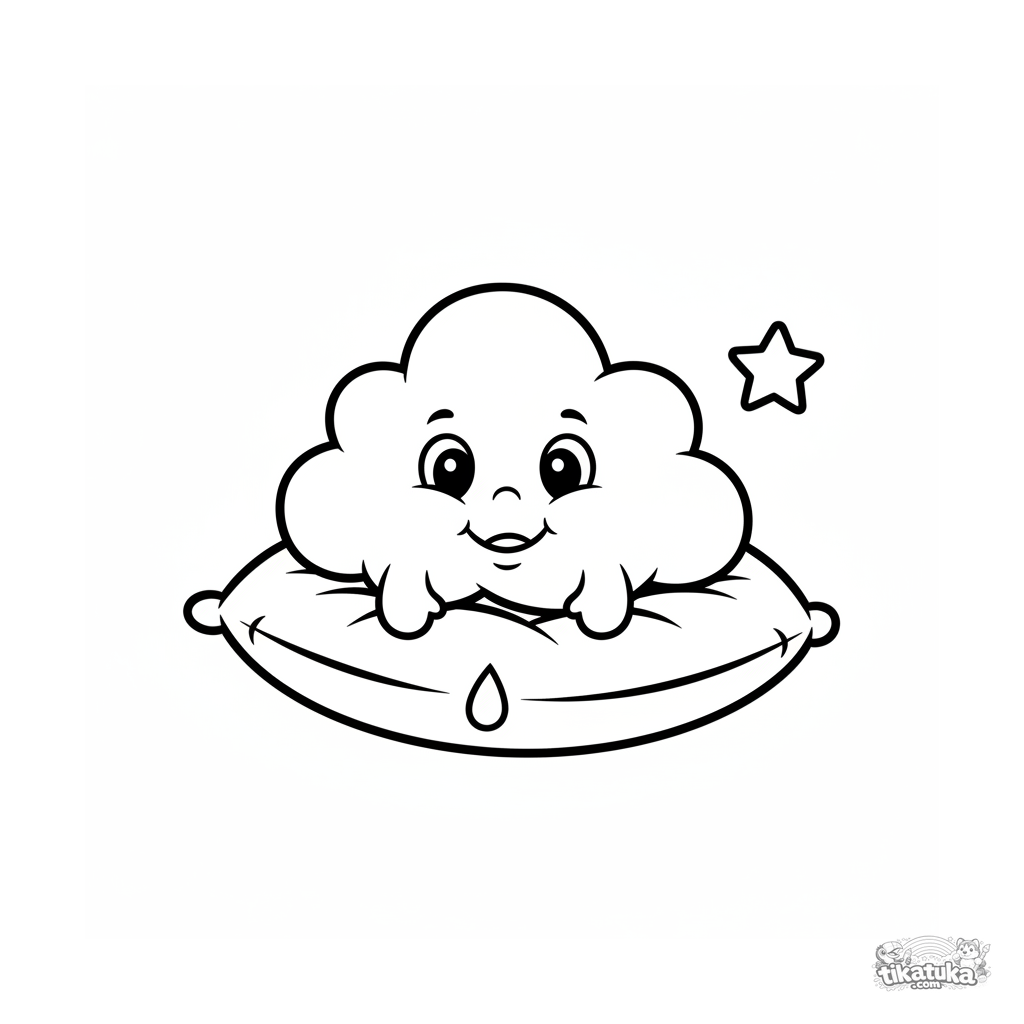 Ausmalbild für Kleinkinder: eine lächelnde flauschige Wolke ruht auf einem weichen Kissen. Sehr einfache Formen, große Flächen zum Ausmalen und breite Ränder.
