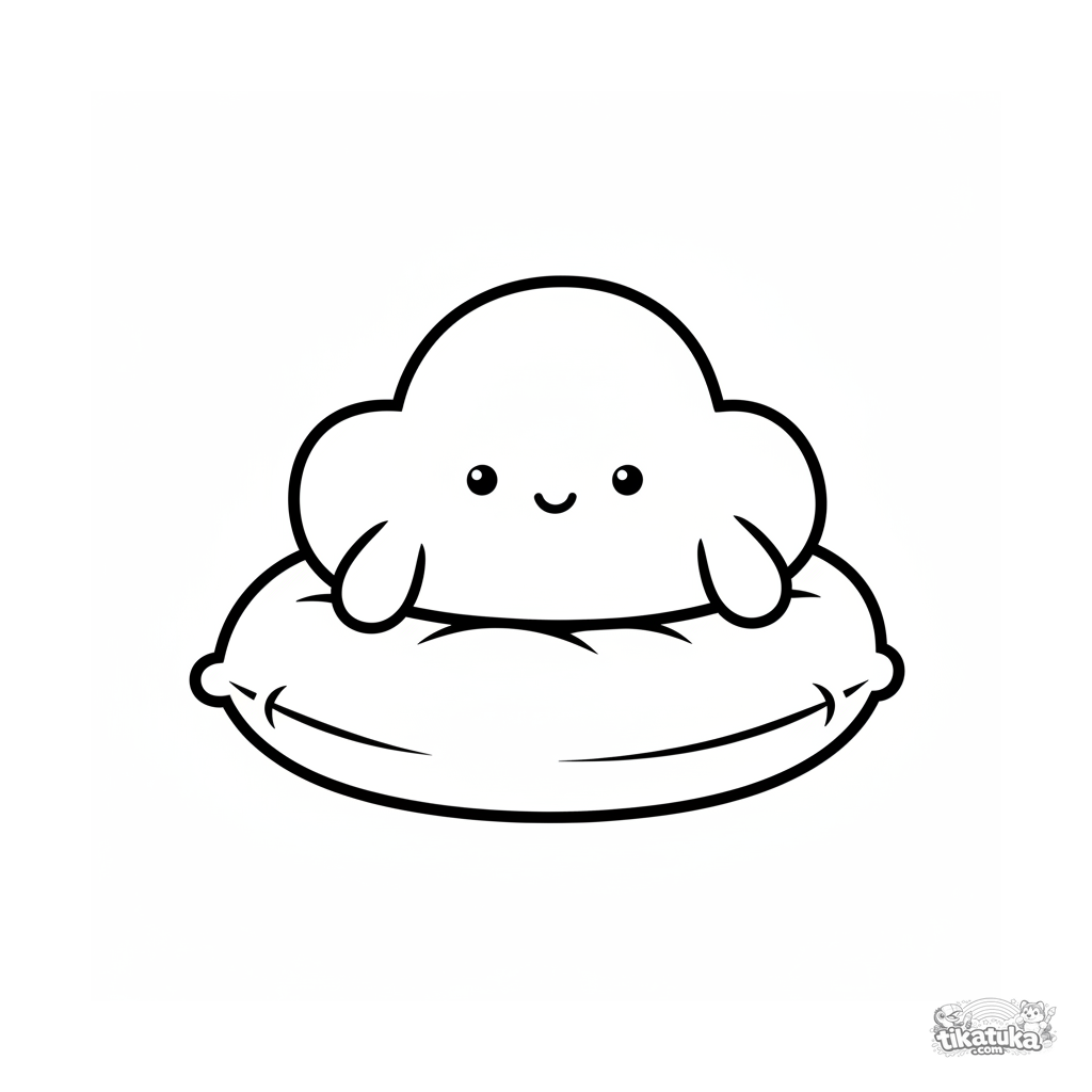 Ausmalbild für Kleinkinder: eine lächelnde Wolke ruht auf einem Kissen. Sehr einfache Umrisse, große Flächen zum Ausmalen.