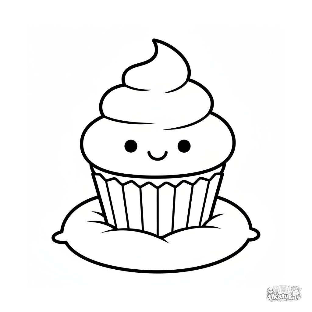 Niedliches Ausmalbild für Kleinkinder: ein lächelnder Cupcake mit Gesicht sitzt auf einem flauschigen Kissen. Sehr einfache und große Formen.