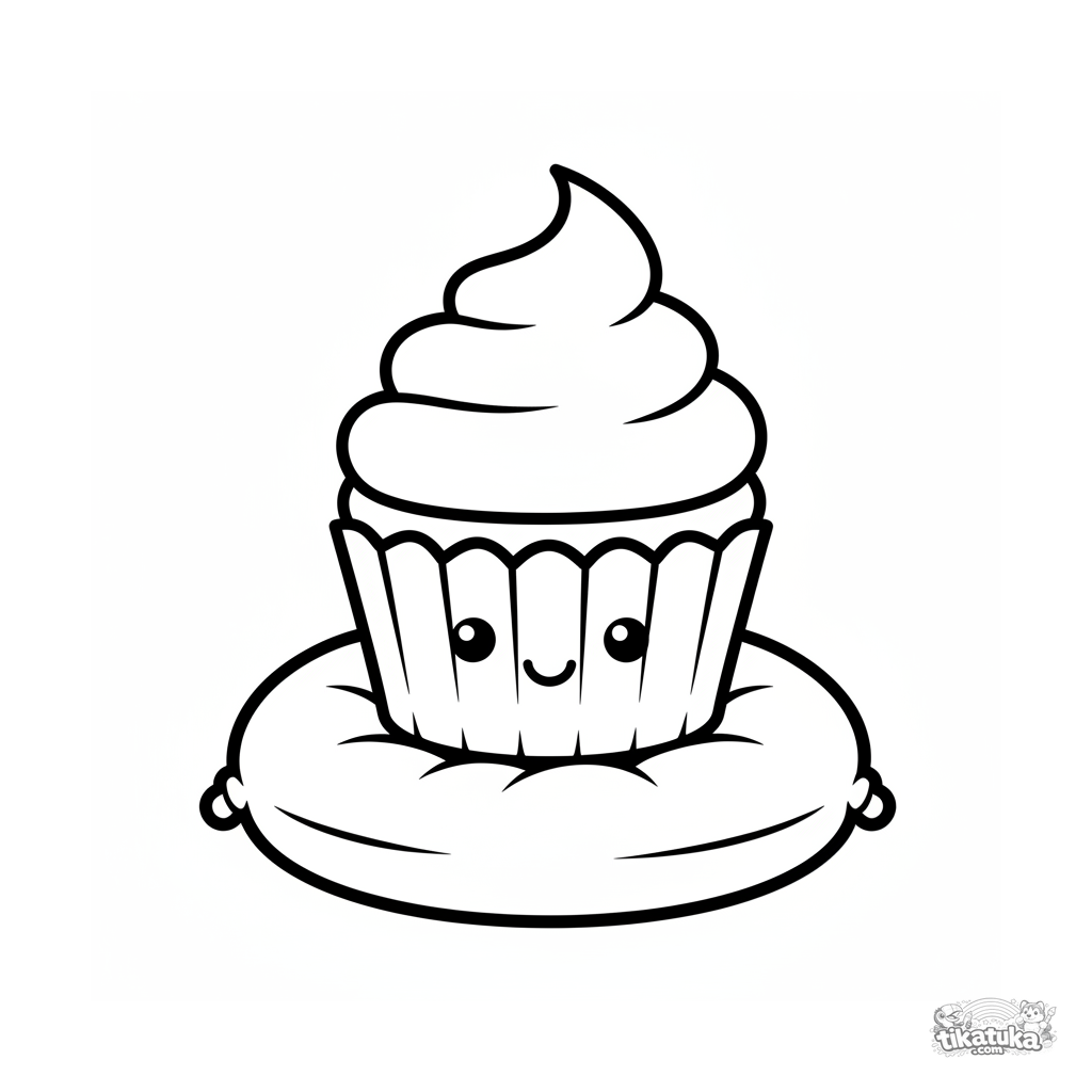 Niedliches Ausmalbild für Kleinkinder: ein lächelnder Cupcake sitzt auf einem Kissen. Kawaii-Stil, riesige einfache Formen, fast keine Details.