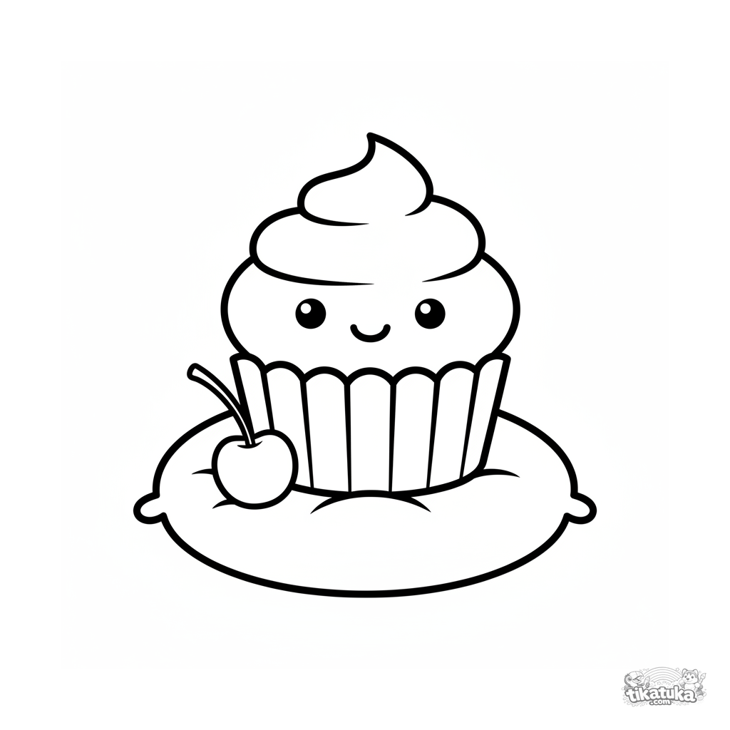 Malmalbild für Kleinkinder: ein lächelnder Cupcake mit einer Kirsche ruht auf einem weichen Kissen. Sehr einfache, große Umrisse, perfekt für Kinder von 2-3 Jahren.