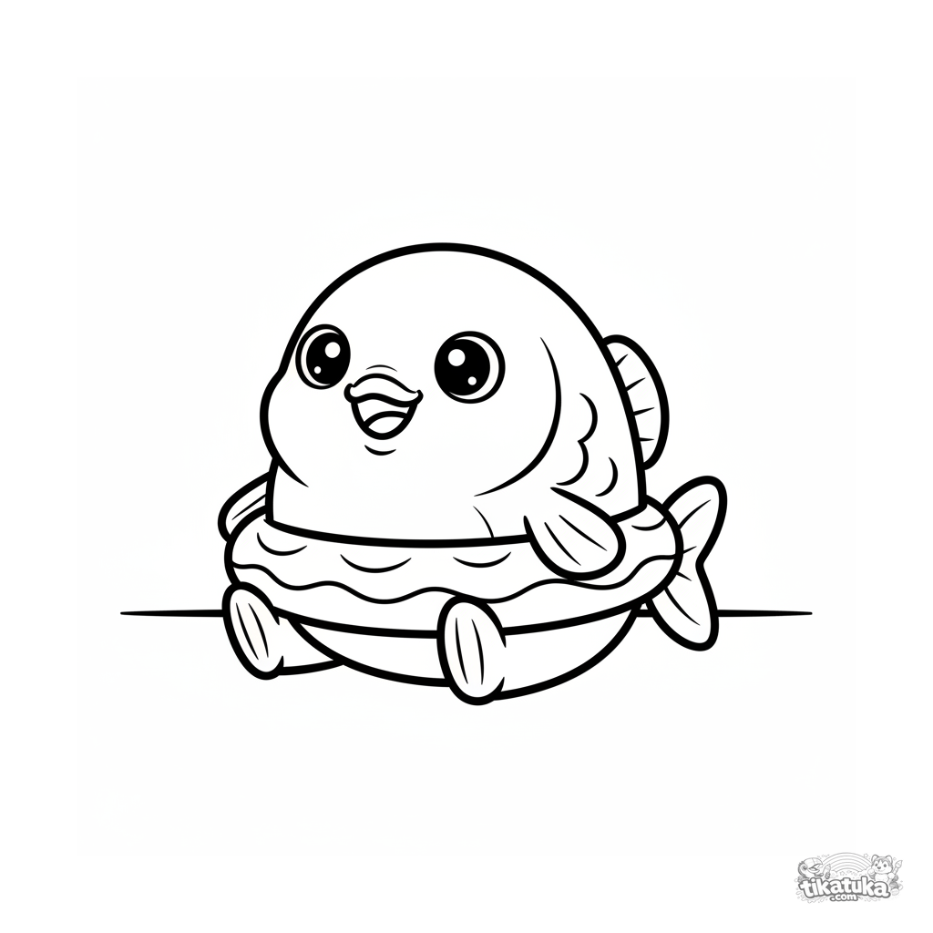 Einfaches Ausmalbild für Kleinkinder 2-3: Ein lächelnder runder Fisch, der einen aufblasbaren Ring trägt, sitzt am Poolboden. Große Ausmalflächen, sehr einfache Formen.