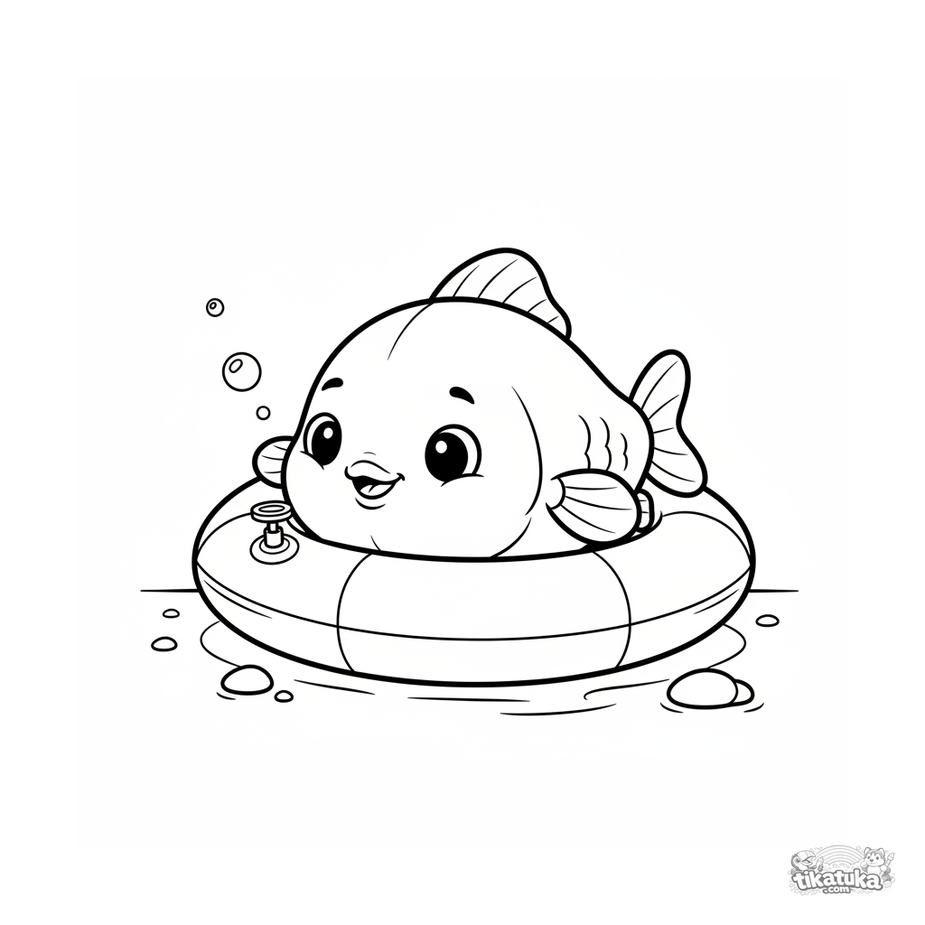 Ausmalbild für Kinder 7-9: Ein lächelnder Fisch schwimmt entlang eines Schwimmrings am Poolboden und untersucht ihn neugierig. Klare Umrisse, ausdrucksstarkes Gesicht.