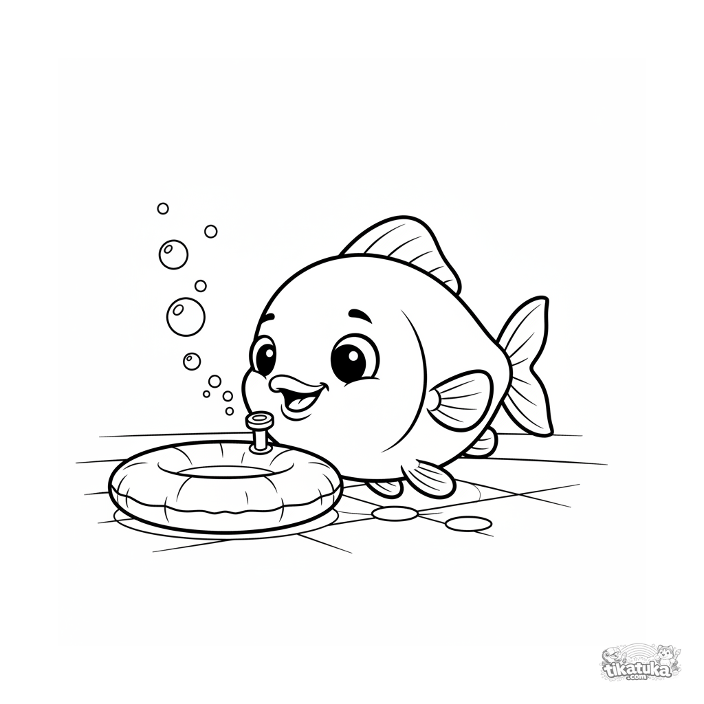 Ausmalbild für Kinder von 4-6 Jahren: Ein lächelnder Fisch untersucht neugierig das Ventil eines Schwimmrings. Klare Komposition, freundliche Geschichte.