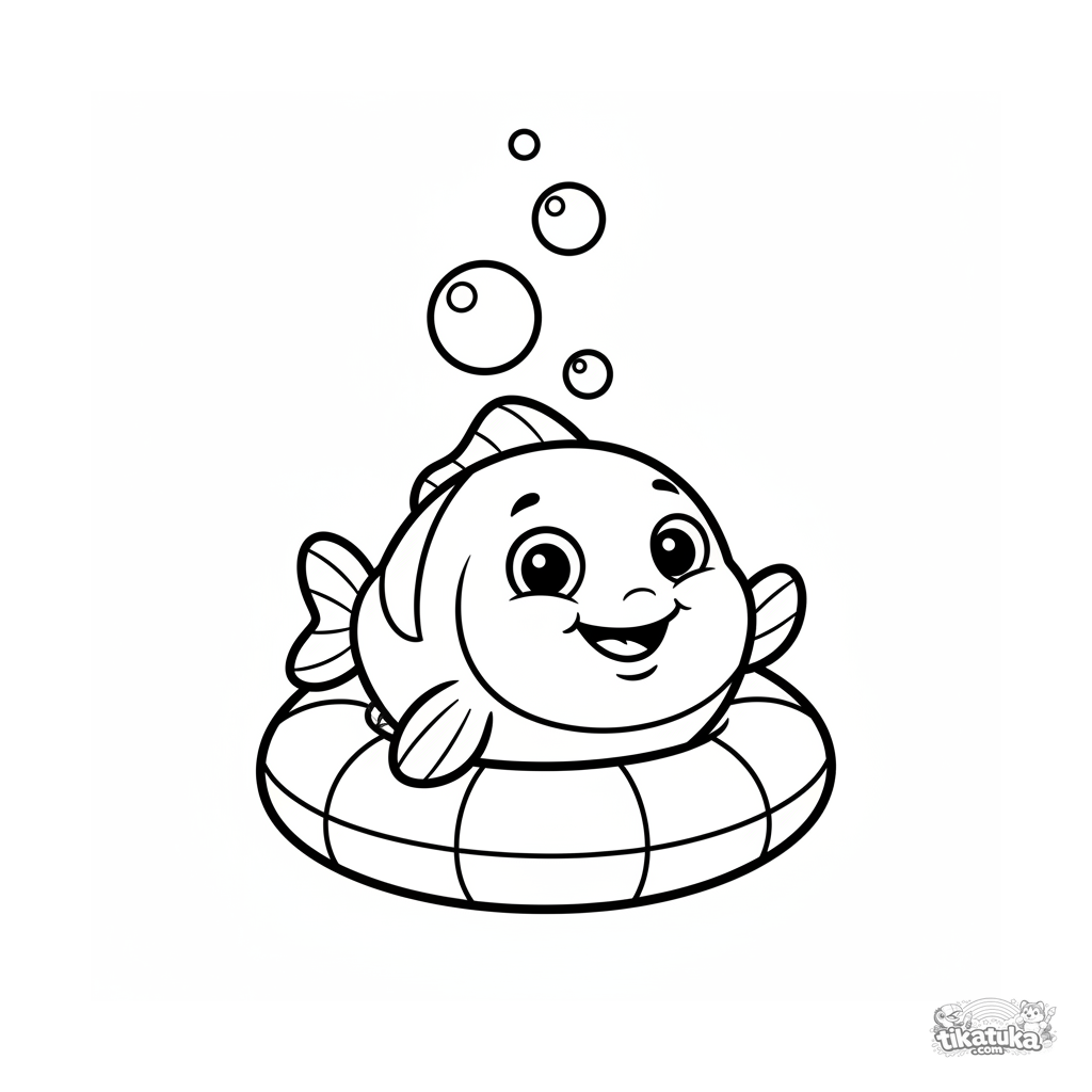 Sehr einfaches Ausmalbild für Kleinkinder 2-3: Ein lächelnder Fisch lugt aus einem aufblasbaren Ring in einem Pool hervor.