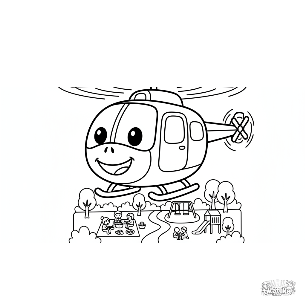 Einfaches Ausmalbild für Kleinkinder 2-3: Ein fröhlicher Hubschrauber mit Gesicht schwebt über einem Park. Große Formen, dicke Umrisse, viel Freiraum.
