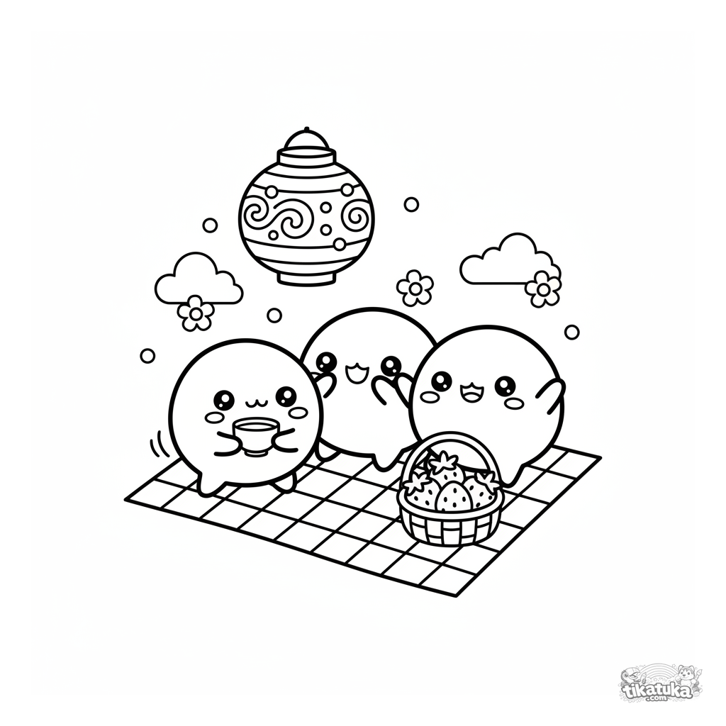 Ausmalbild von drei lächelnden Mochi bei einem Picknick. Für Kinder von 4-6 Jahren. Zeigt runde Reiskuchen, die auf einer karierten Decke mit einem Korb Erdbeeren balancieren.
