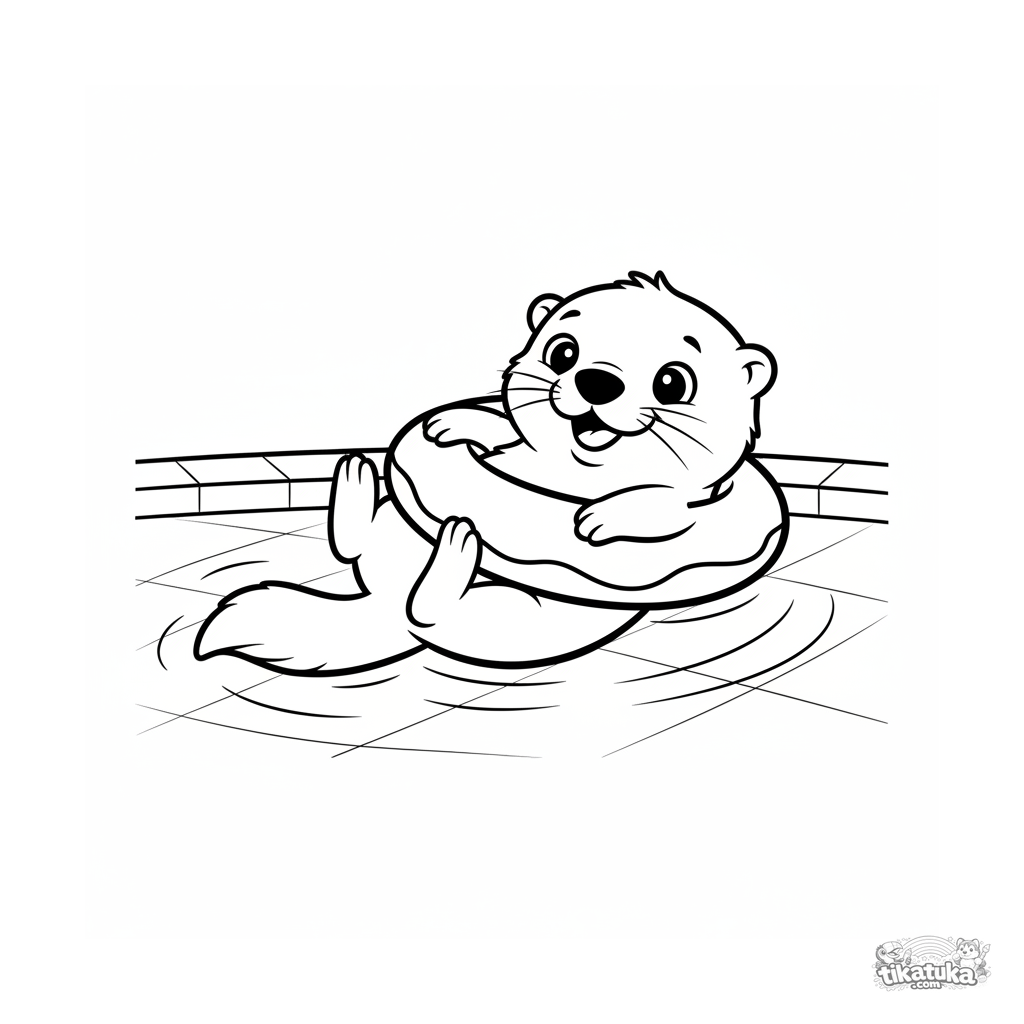 Einfaches Kleinkind-Ausmalbild eines Otter-Jungen, das auf dem Rücken schwimmend einen Poolring umarmt. Für Kinder von 2 bis 3 Jahren.