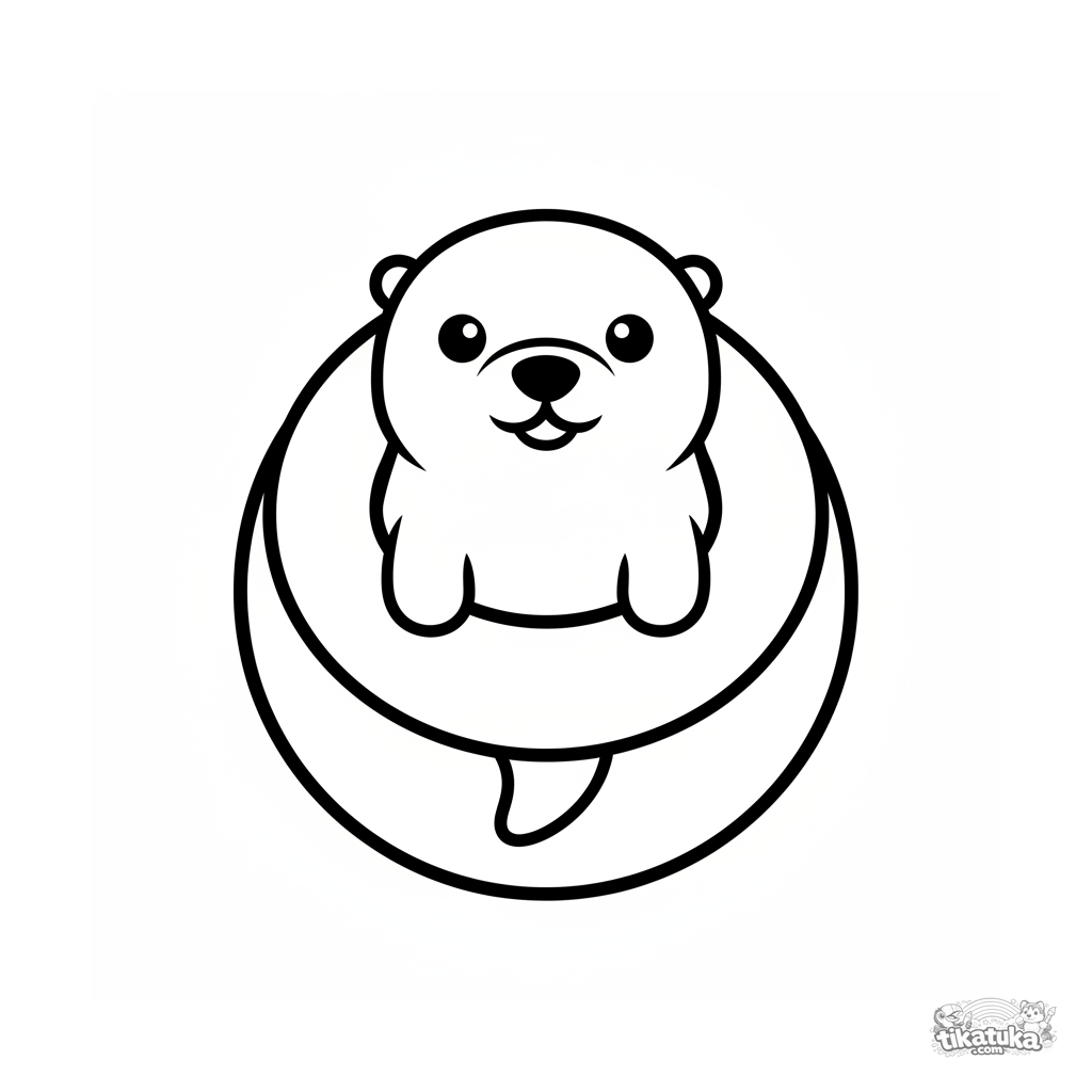 Einfaches Ausmalbild für Kleinkinder 2-3: ein lächelndes Otter-Baby liegt in einem Schwimmring in einem Pool. Riesige Flächen zum Ausmalen, sehr einfache Umrisse.