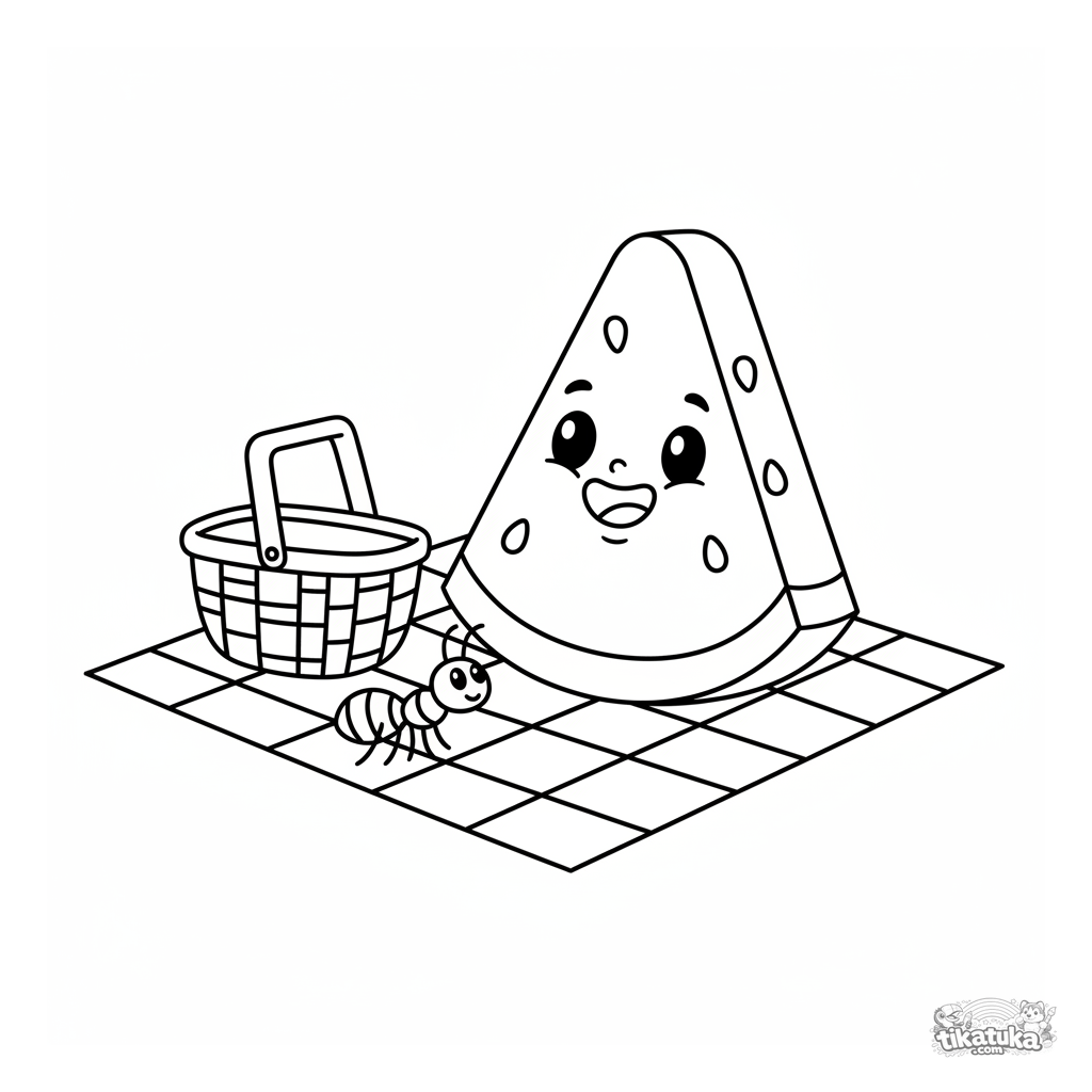Lustiges Ausmalbild für Kleinkinder von 2-3 Jahren: eine lächelnde Wassermelonenscheibe beim Picknick. Riesige einfache Formen, freundliches Gesicht.