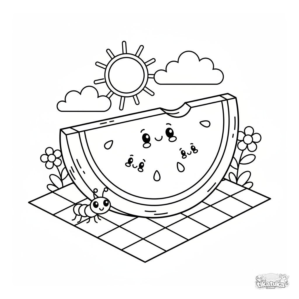 Lustiges Ausmalbild für Kinder von 4-6 Jahren mit einer Wassermelonenscheibe. Das saftige Fruchtfleisch hat Samen mit lächelnden Gesichtern, die auf einer karierten Decke liegen.