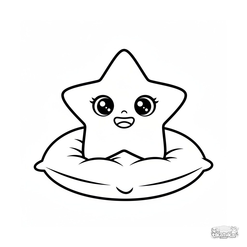 Helles und einfaches Ausmalbild für 2-3 Jahre: ein lächelnder Stern ruht auf einem Kissen. Große Zacken und ein freundliches Gesicht, perfekt für erste Buntstifte.