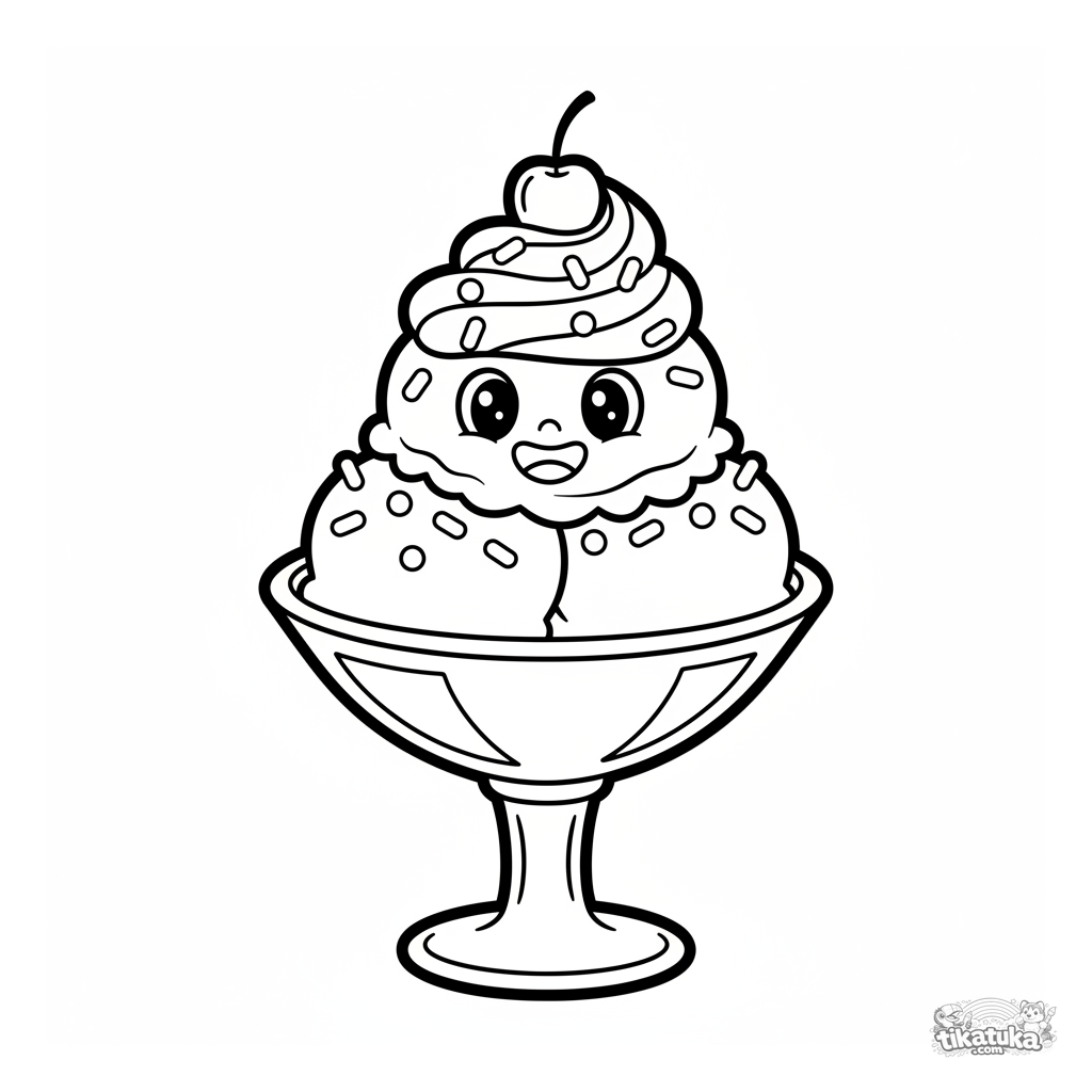 Einfaches Ausmalbild einer lächelnden Eisschale mit Streuseln für Kleinkinder von 2-3 Jahren. Große, einfache Formen perfekt für erste Buntstifte.