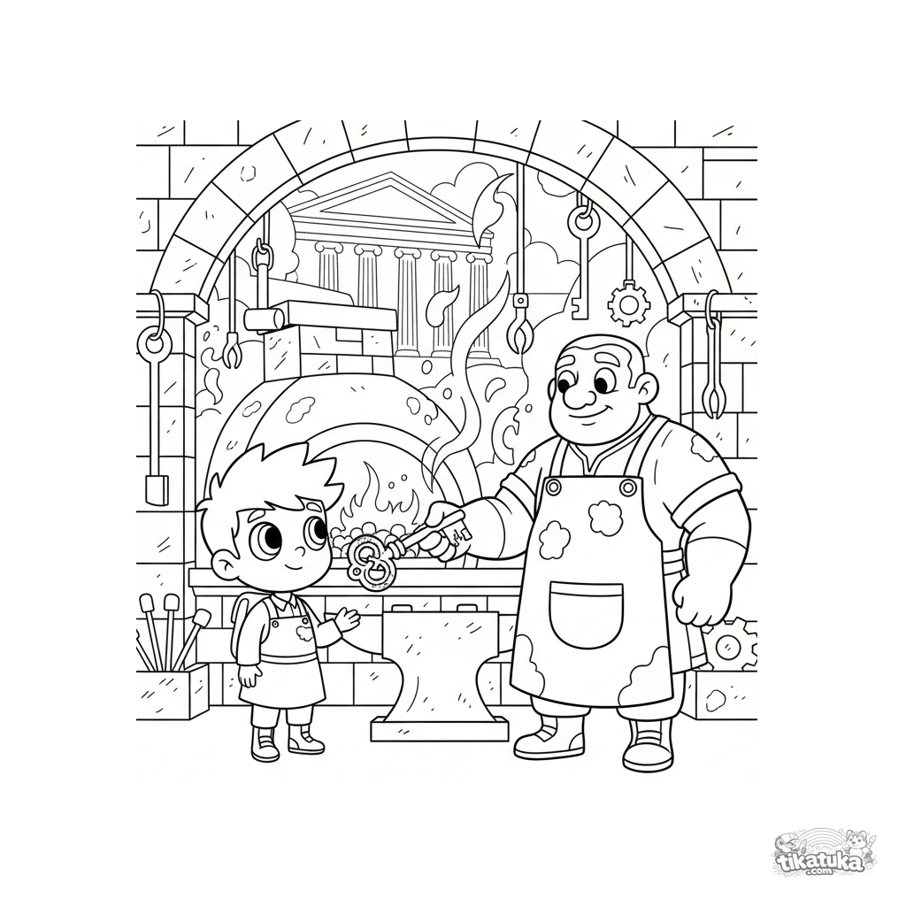 Ausmalbild für Kinder 6-11: Ein freundlicher Schmiedegott hilft einem Reisenden in seiner Schmiede an einem Marmorpalast. Viele Werkzeugdetails und dynamische Szene.