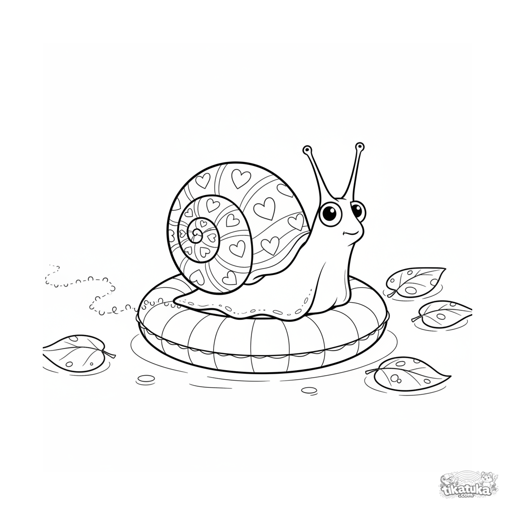 Detailliertes Ausmalbild für ältere Kinder von 10-12 Jahren: Eine Schnecke mit gemustertem Haus kriecht langsam am Rand eines aufblasbaren Rings entlang.