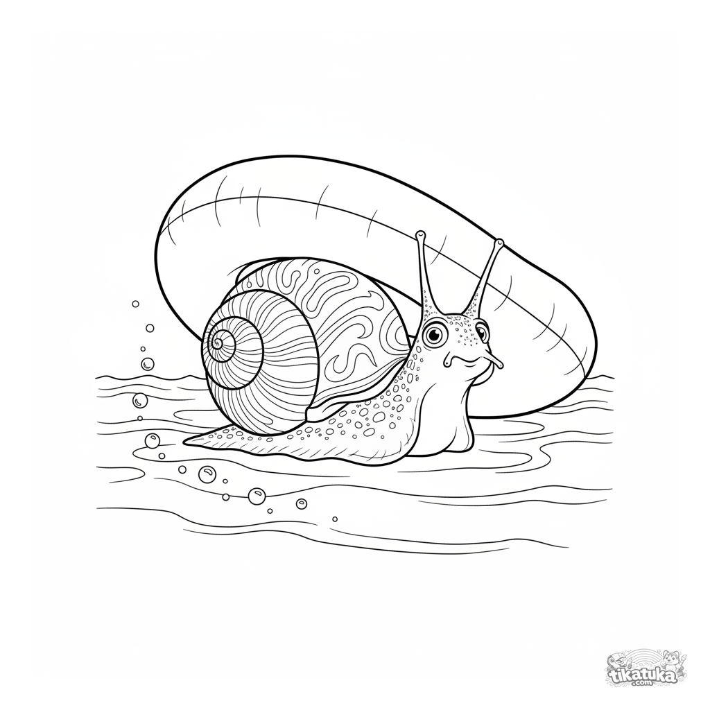 Detailliertes Ausmalbild für Kinder 10-12: Eine Schnecke mit spiralförmigem Gehäuse lugt vorsichtig unter dem Rand eines Schwimmrings auf dem Beckenboden hervor.
