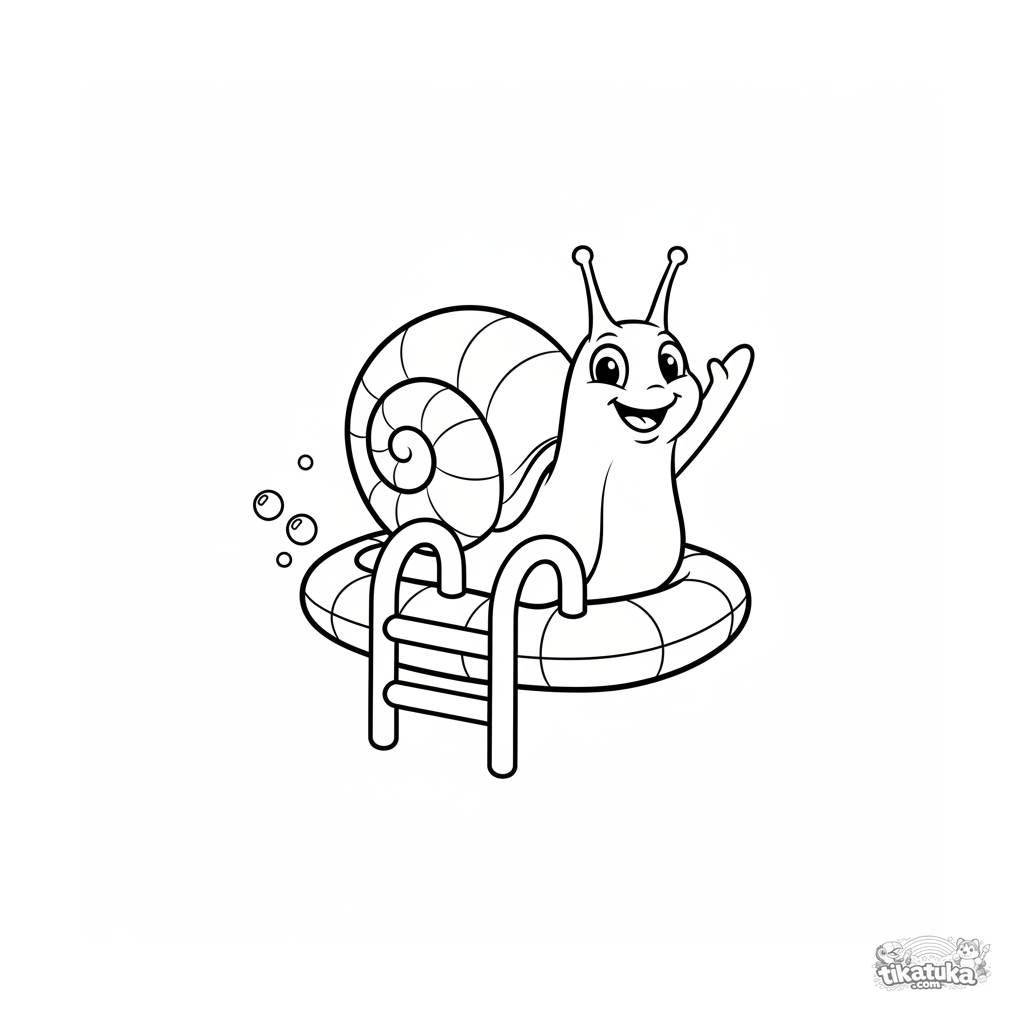 Ausmalbild für Kinder 7-9: eine fröhliche Schnecke auf einem aufblasbaren Floß an der Poolleiter winkt mit ihrem Augenstiel. Ausdrucksstarke Szene, klare Details.