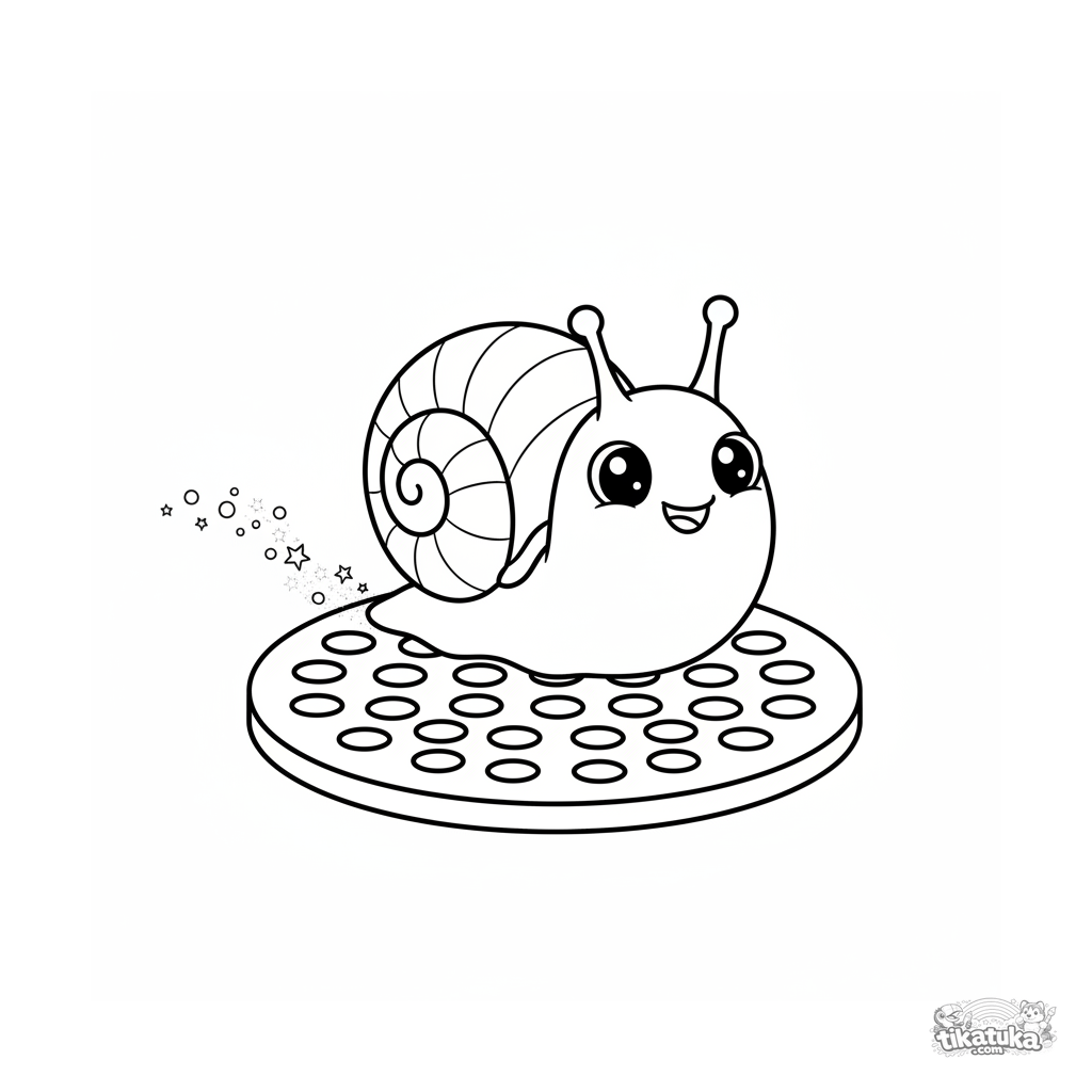 Malmalblatt für Kleinkinder: Eine winzige Kawaii-Schnecke kriecht über einen Poolablaufrost am Boden. Sehr einfache Formen, große Flächen zum Ausmalen, niedlicher Gesichtsausdruck.