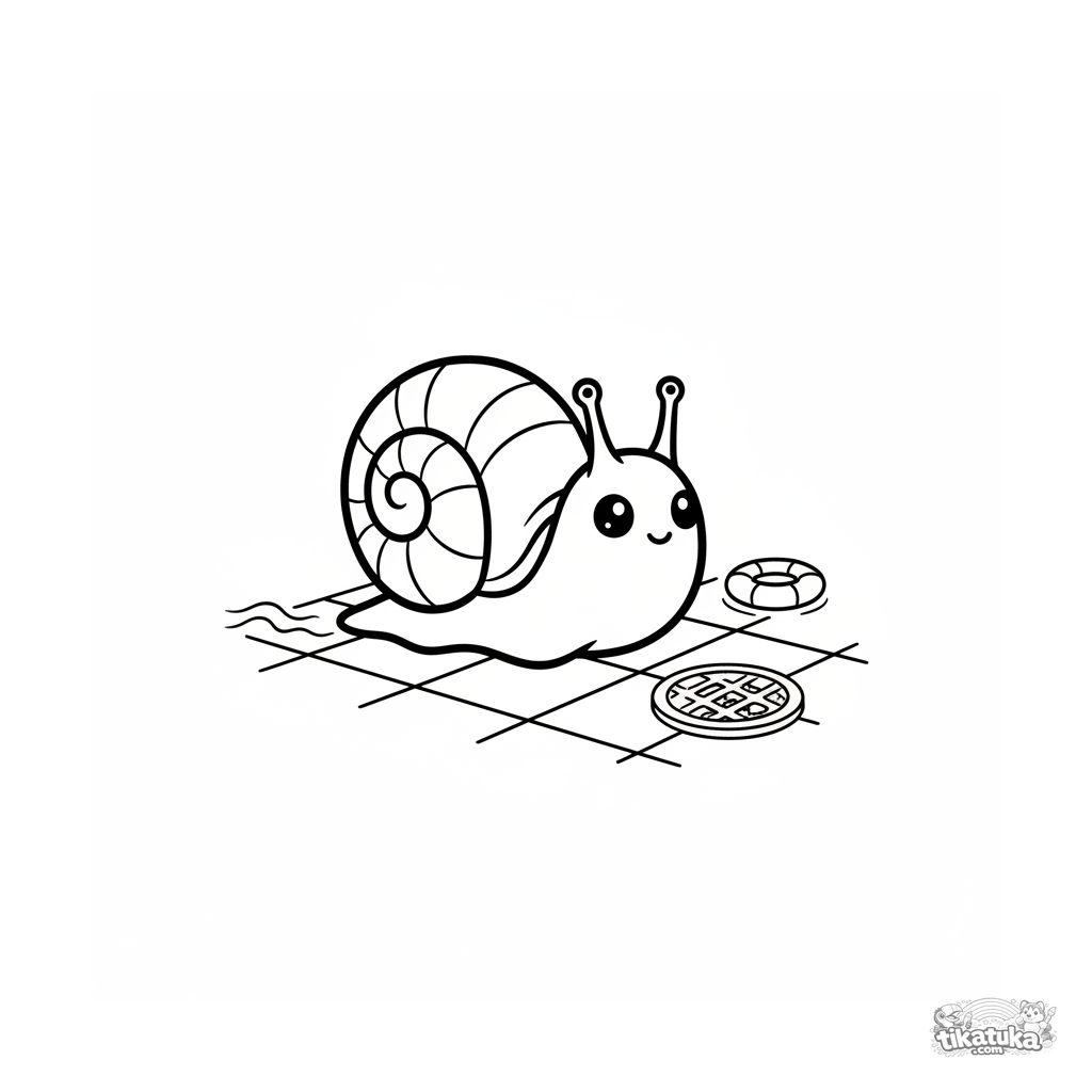 Ausmalbild für Kinder 7-9: Eine süße Schnecke im Holzspielzeug-Stil krabbelt über die Poolbodenfliesen auf einen Ablauf zu. Einfache geometrische Formen.