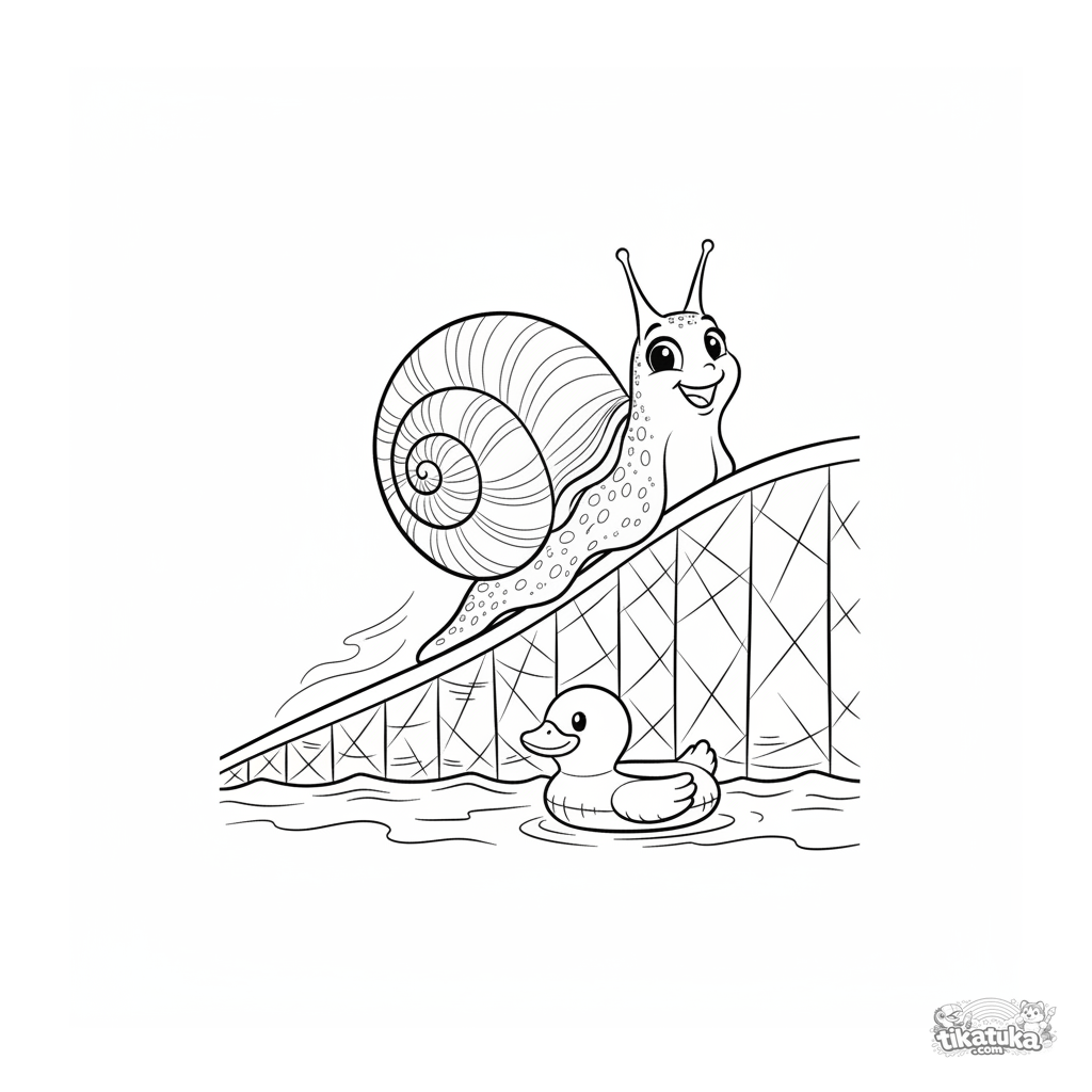 Detailliertes Ausmalbild für ältere Kinder 10-12: Eine Schnecke rutscht fröhlich die abgeschrägte Seite eines aufblasbaren Beckens hinunter. Realistische Schalentextur und Schleimspur.