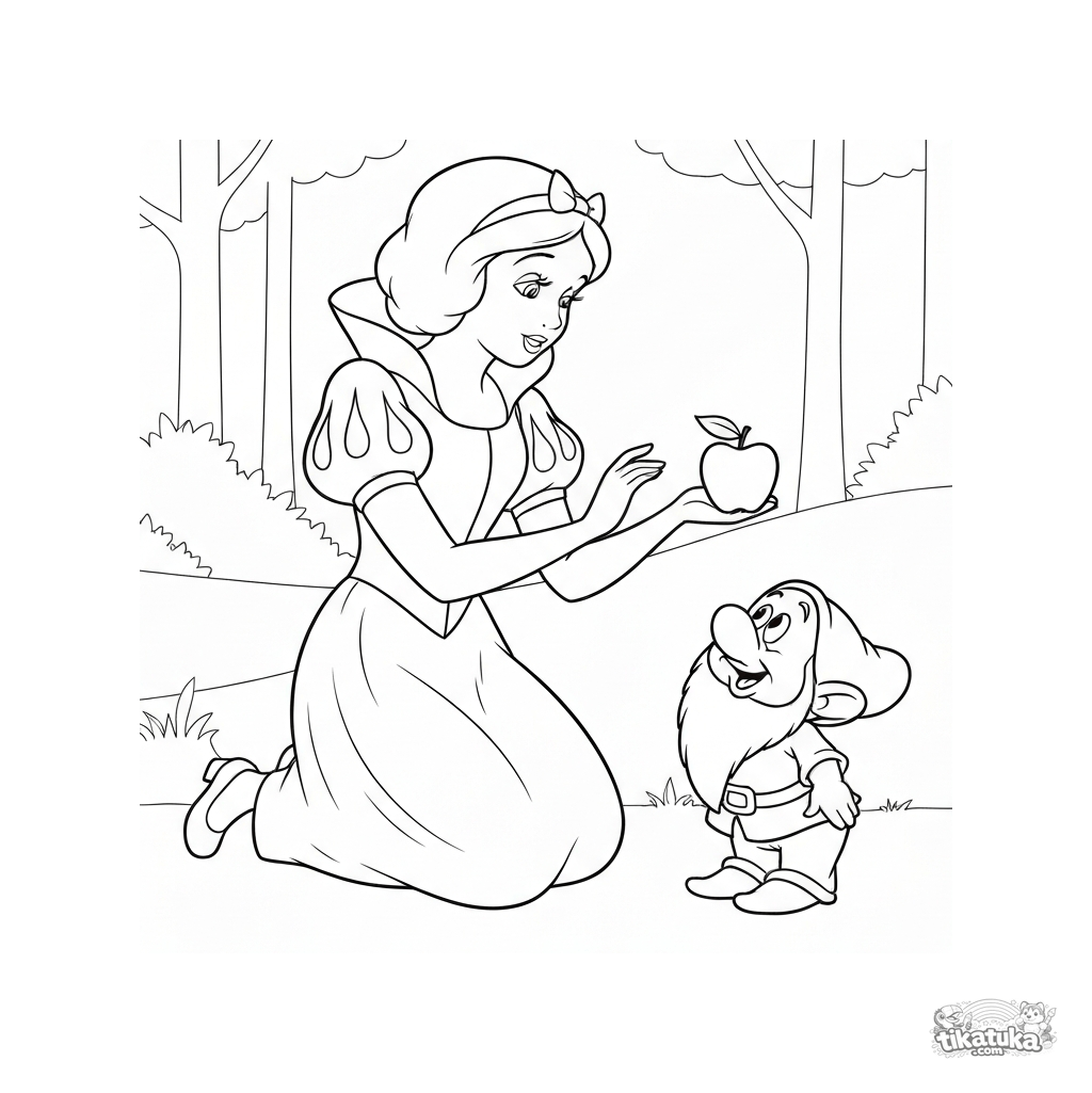 Ausmalbild für Kinder. Schneewittchen bietet dem Zwerg Seppl einen glänzenden Apfel im Wald an. Süße Märchenszene zum Ausmalen. Kostenlos herunterladen.
