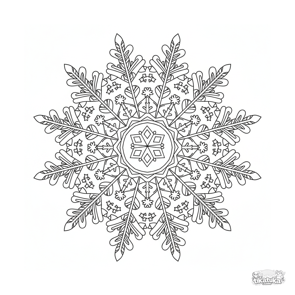 Exquisites schneeflockenförmiges Mandala mit sechsfacher Symmetrie. Komplexes Muster mit Eiskristallen für Kinder von 10-12 Jahren.