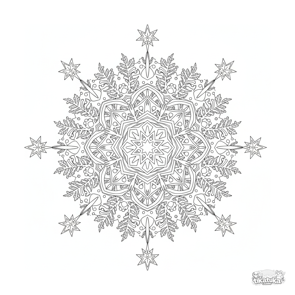 Komplexe Schneeflocken-Mandala-Ausmalbild für 10-12 Jahre. Sechsfache Symmetrie, Eiskristalle, Frostmuster—ein detailliertes geometrisches Winterdesign perfekt zum konzentrierten Ausmalen.