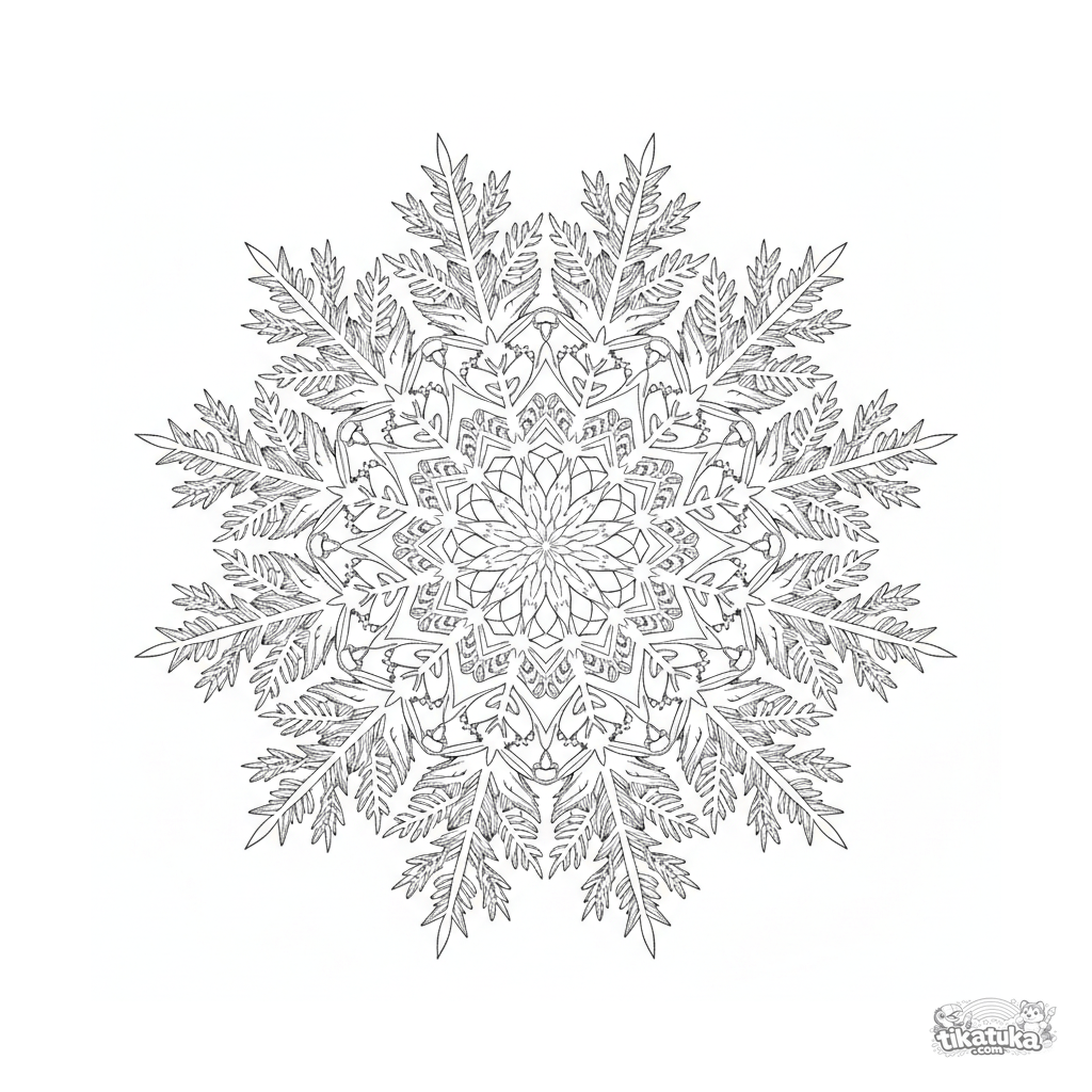 Detailliertes Schneeflocken-Mandala-Ausmalbild mit Eiskristallen für Kinder von 10-12 Jahren. Perfekte sechsfache Symmetrie und zarte Wintermuster für eine kreative Ausmalzeit.