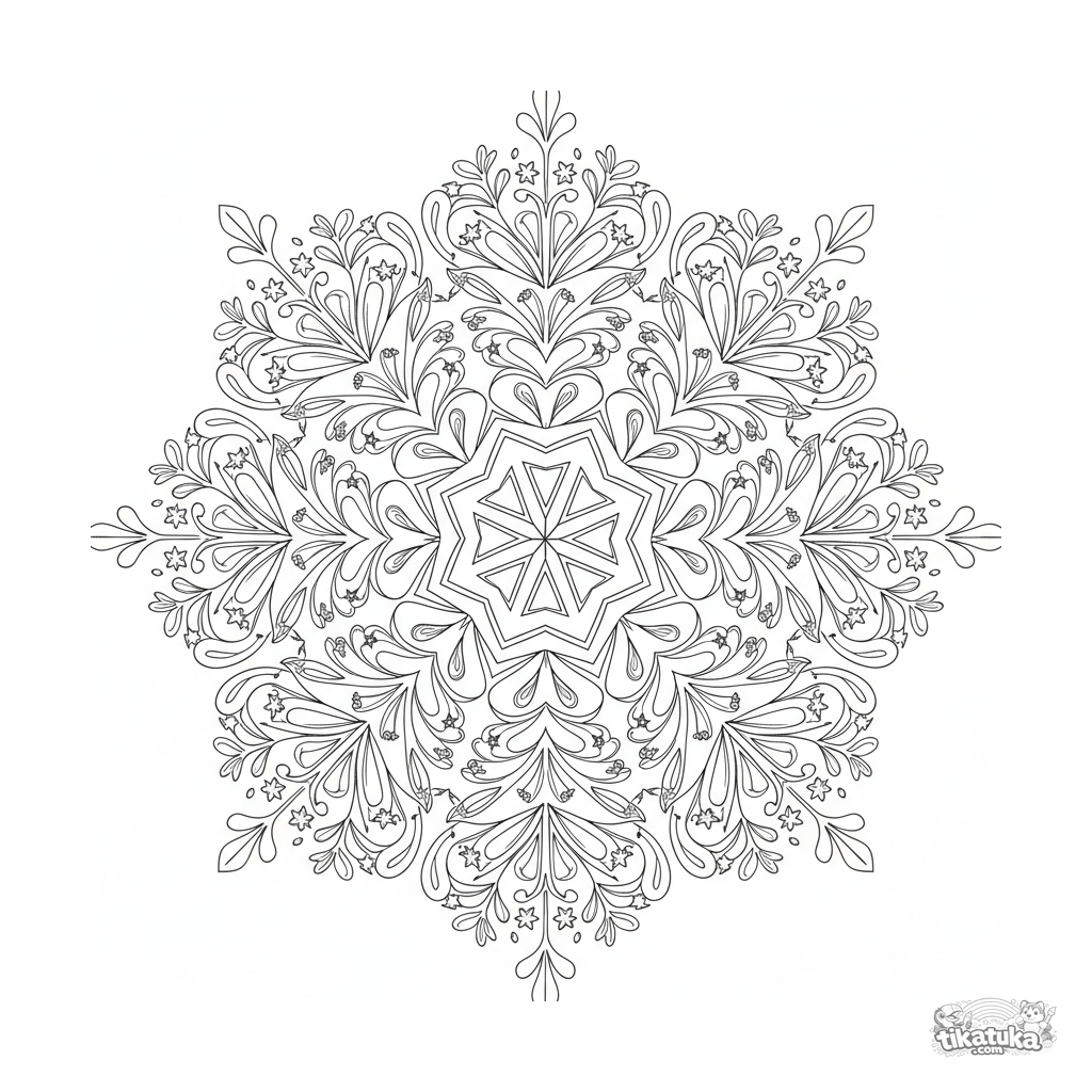 Detaillierte Schneeflocken-Mandala-Ausmalbild für 10-12 Jahre. Sechseckiger Eiskristall in der Mitte mit komplexen federartigen Verzweigungen und Sterndetails in sechsfacher Symmetrie.