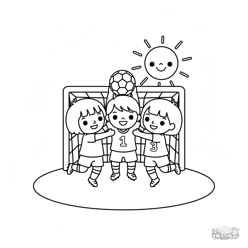 Kleinkind-Ausmalbild 2-3: Ein glückliches Fußballteam von Kindern springt vor Freude nach einem Tor. Einfache Szene mit großen, klaren Formen.