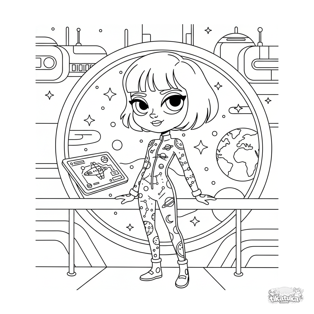Futuristisches Ausmalbild für 10-12 Jahre: ein Mädchen in einem Sonnensystem-bedruckten Overall auf dem Aussichtsdeck einer Raumstation, das die Erde durch ein großes Fenster betrachtet.