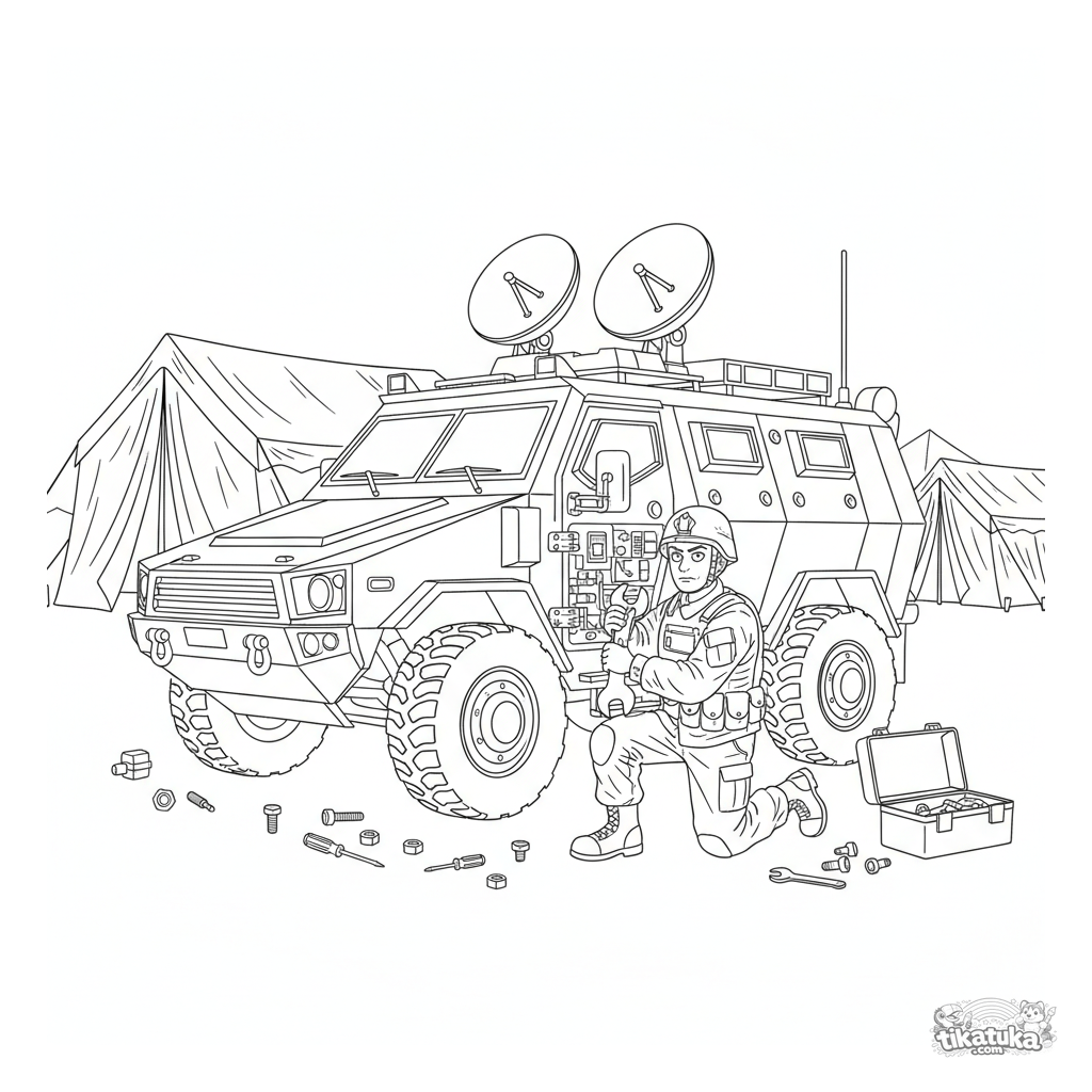 Detailliertes Ausmalbild für 10-12 Jahre: Ein Soldat repariert ein Kommunikationsfahrzeug an einem Feld-HQ. Viele Werkzeuge, offene Klappe, Zelte im Hintergrund.