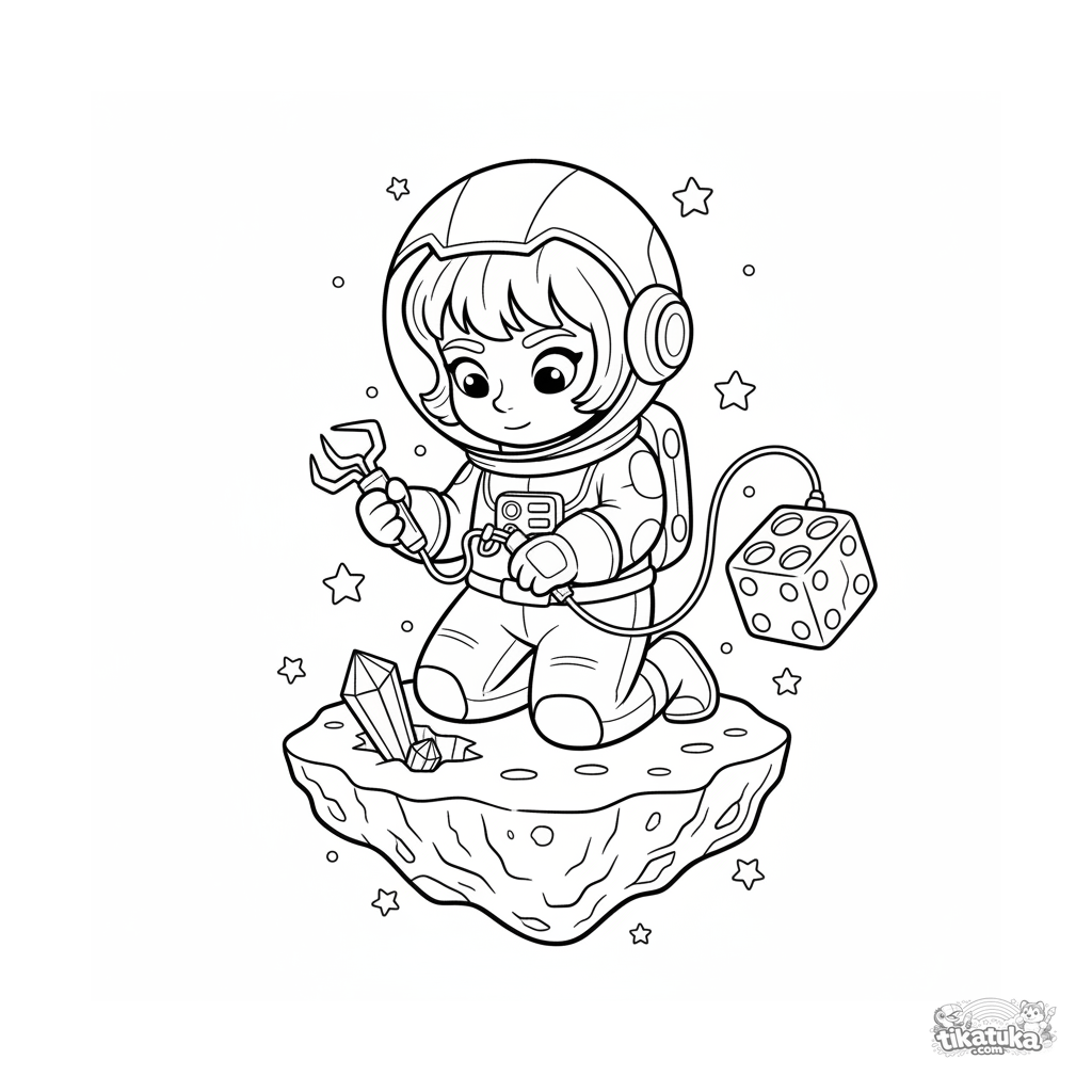 Ausmalbild für 10-12 Jahre: Ein Weltraum-Biologe auf einem schwebenden Asteroiden sammelt Kristallproben im All. Detaillierter Anzug, wissenschaftliche Werkzeuge.