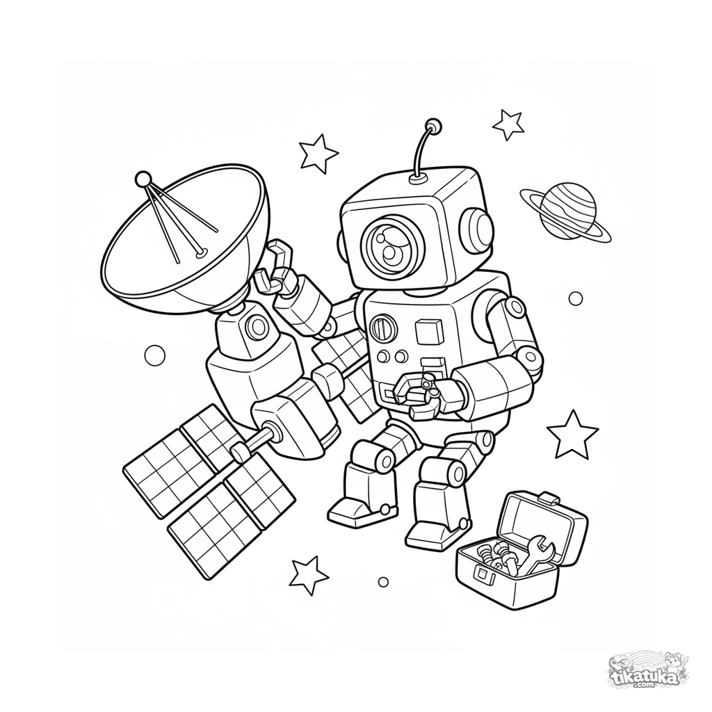 Ausmalbild für Kinder 7-9: Ein klobiger Roboter-Ingenieur repariert eine Satellitenschüssel im Weltraum zwischen Sternen. Eine aktive Szene mit ausdrucksstarken Details.